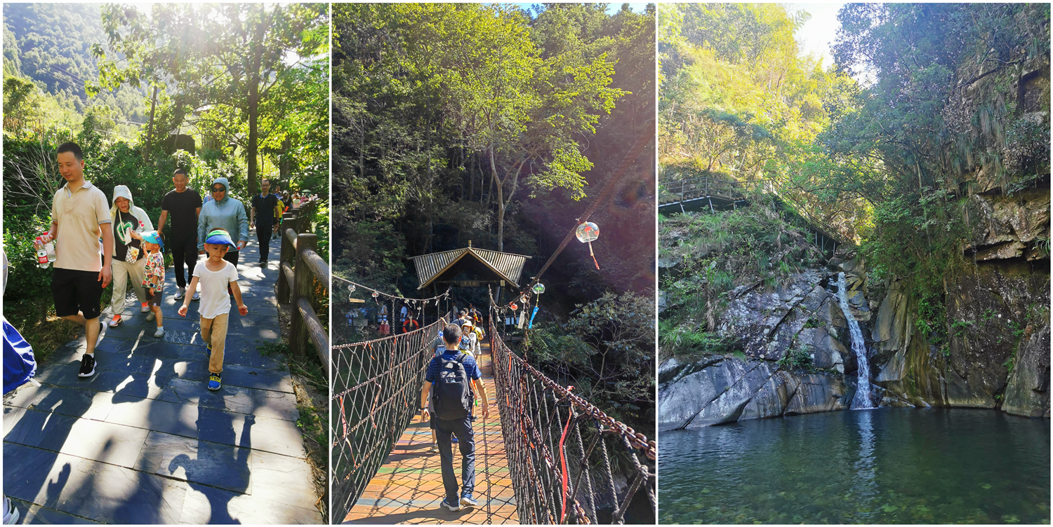 晚上體驗了農(nóng)家樂菜肴和當(dāng)?shù)靥厣袼藓?,第二天早早的起床,吃完早餐集合,大家興致勃勃地乘著大巴來到了醉山野景區(qū),這里是安徽省內(nèi)第一個5D玻璃橋皖南地區(qū)最大的瀑布群。在進(jìn)入景區(qū)之前,有一段鄉(xiāng)村道路,徒步的過程頂著早上八九點的太陽就覺得酷暑難耐,然而當(dāng)我們正式踏入景點,走在山谷間的步棧道上,遠(yuǎn)處是蔥郁的山林、近處是流動的溪水、頂上是一片陰涼,只聽見大朋友們小朋友們都在說“好涼快啊,好涼快??!”沿著步棧道繼續(xù)前行,來到了千花橋,這里是著名的網(wǎng)紅打卡點,小朋友們都絡(luò)繹不絕的脫下鞋子、挽起褲腳,下水嬉戲游玩。有合影拍照的、有撿起小石片仍水花的、還有在石頭縫里抓螃蟹的。大家坐在陰涼的石頭塊上休憩閑聊,甚至玩笑起來,富硒山水、天然氧吧,以后老了退隱山林一定要來這里休養(yǎng)生息。有人不被沿途風(fēng)景耽誤過久,繼續(xù)往山上攀爬,他們到了山頂穿過了玻璃棧橋,體驗了“一覽眾山小”的視野和格局。由于兩個月沒有下雨,雖有山谷溪流卻看不到震撼的黃崖瀑布群,實屬遺憾,卻也給大家下次再來此一游留下了機(jī)會。